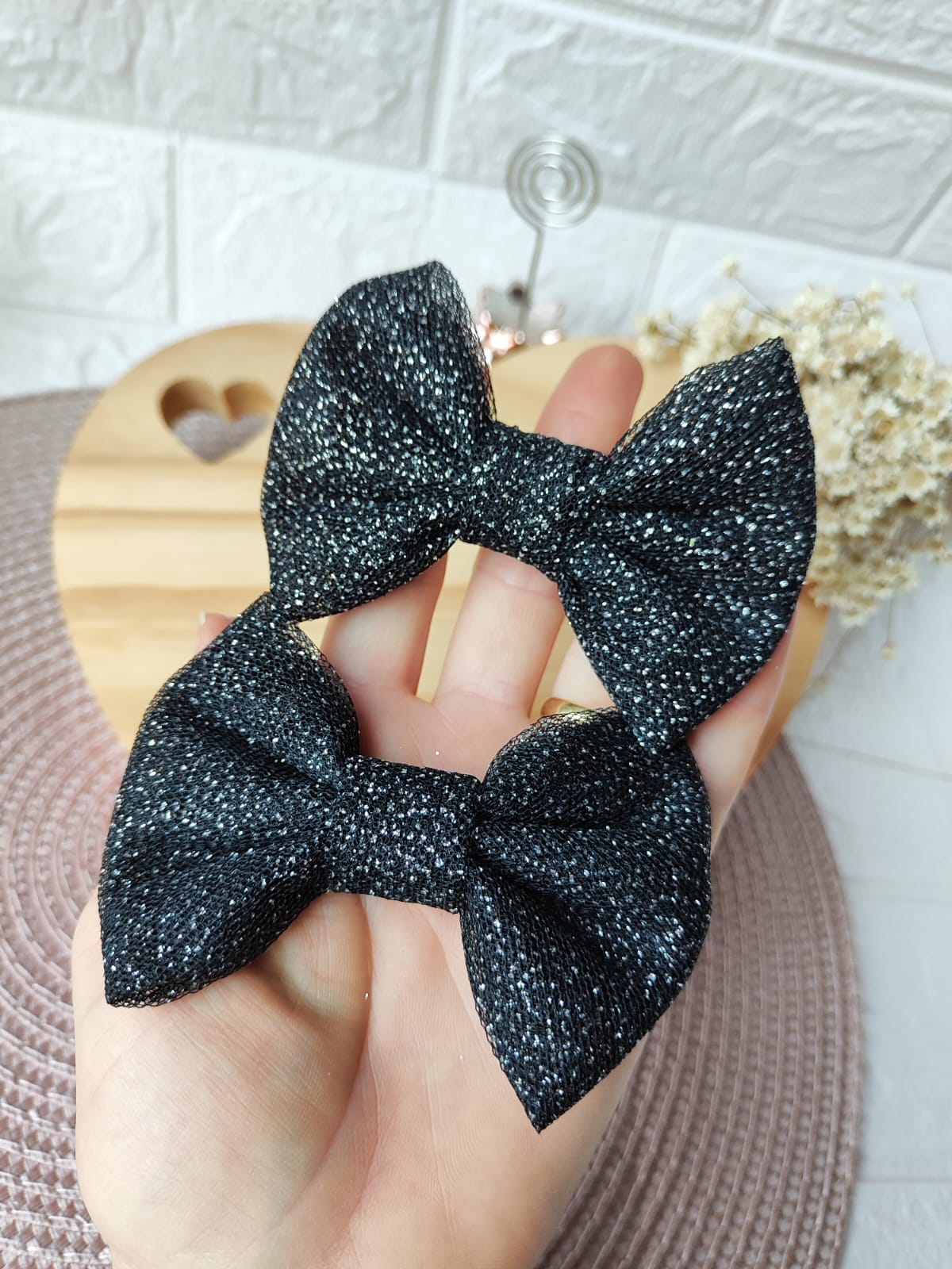 Laço glitter preto com aproximadamente 9 cm